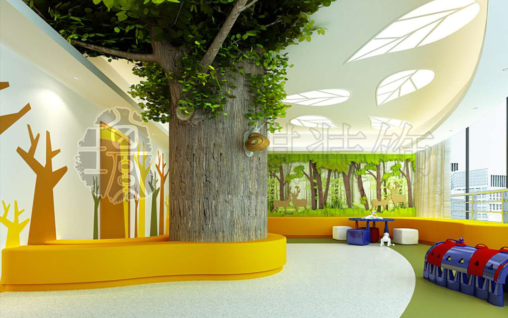 而兒童的色彩天性,偏向讓人激動的暖色調顏色,如黃色、紅色等,因而兒童病區采用大地、海洋、森林等自然色彩格調,并以卡通人物和各種動物為背景。